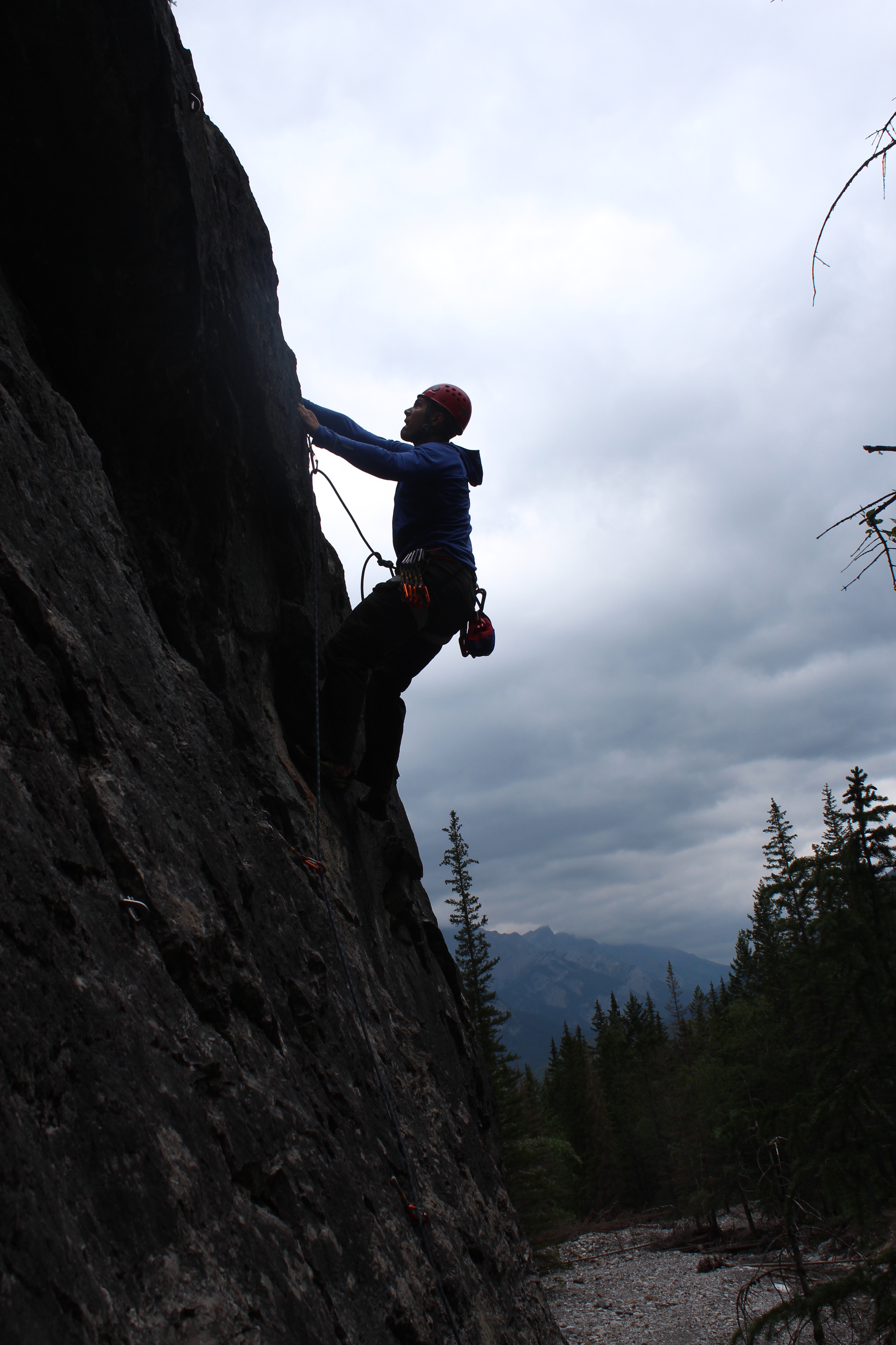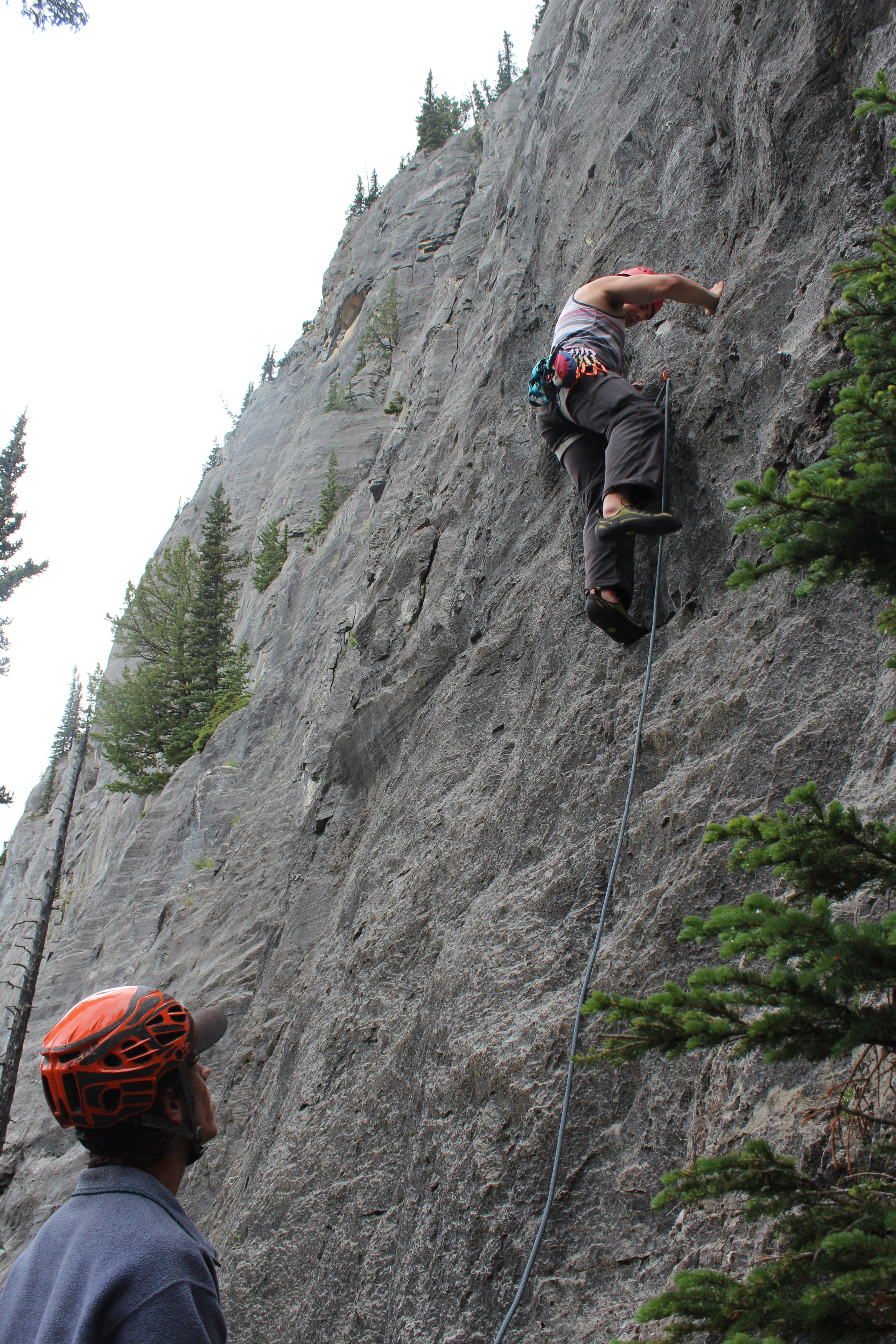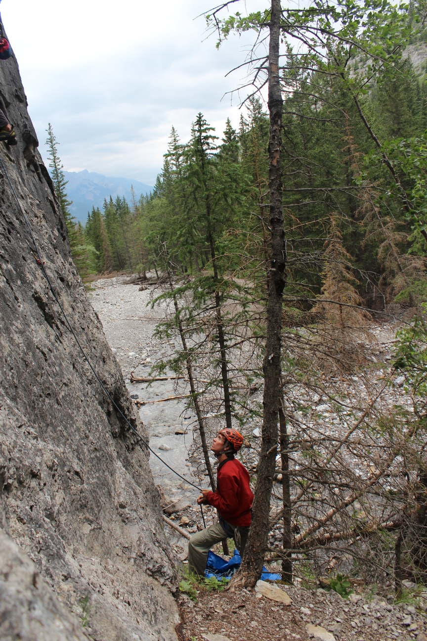 Just yesterday (July 4th, Independence day!) we climbed at Heart Creek near Canmore. The area is much less remote, with no river crossings involved. You just drive down Highway 1, and park in a gravel lot.